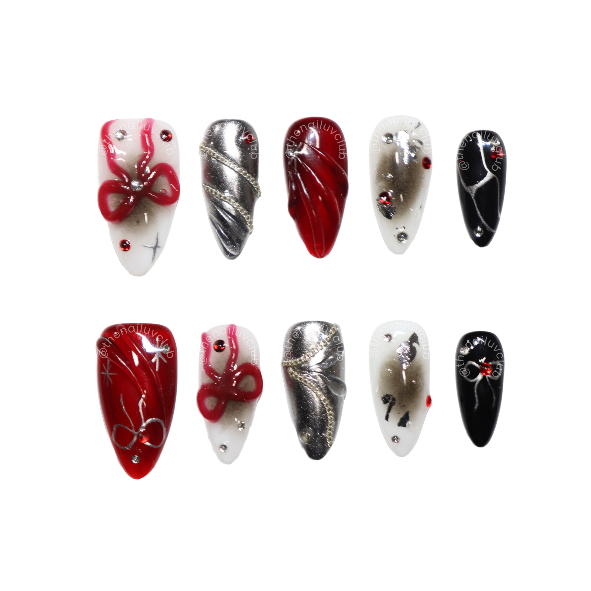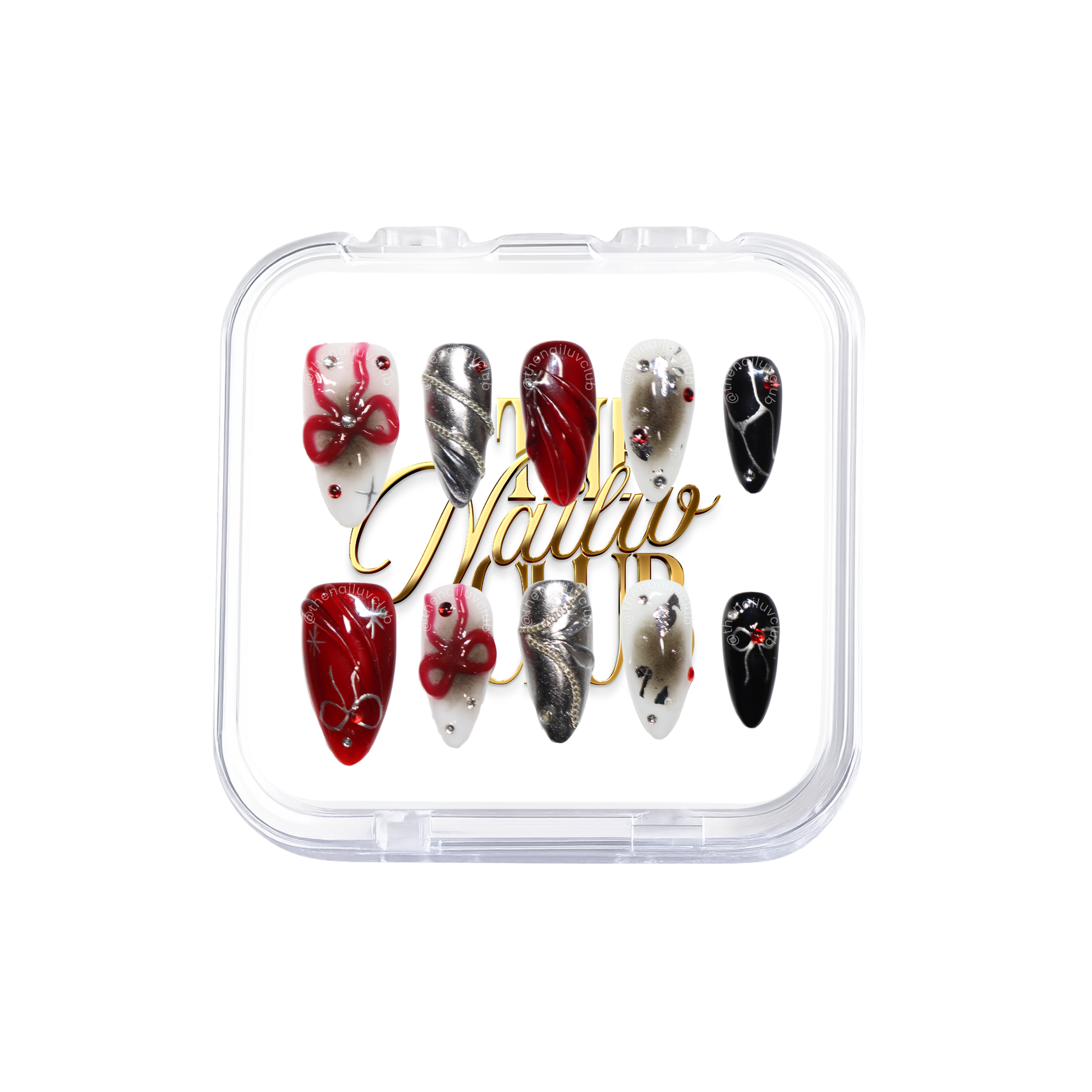 Un diseño glamuroso con base negra y roja, acentuado por flores 3D, brillos metálicos y detalles plateados. Ideal para quienes buscan un look elegante, atrevido y con presencia.