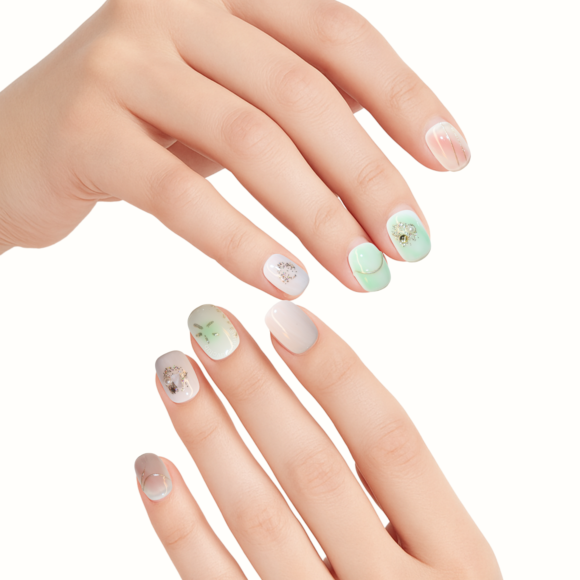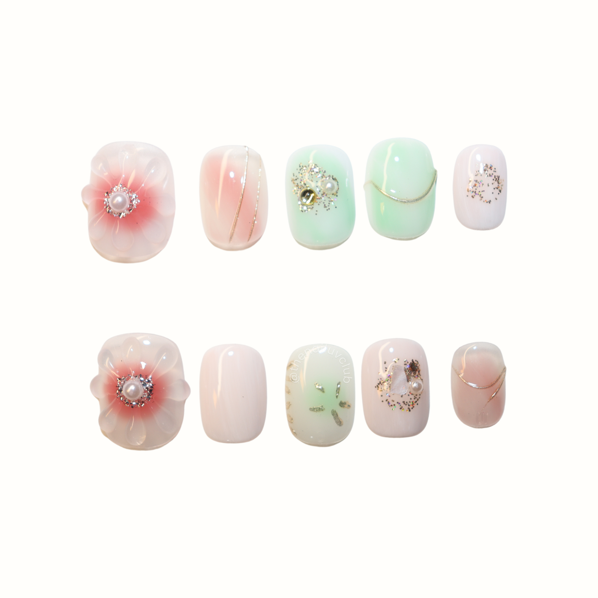 Un diseño delicado y femenino que combina flores 3D con perlas en tonos rosados, verdes y nude. Incluye detalles dorados y destellos de glitter que aportan un acabado elegante y sofisticado.