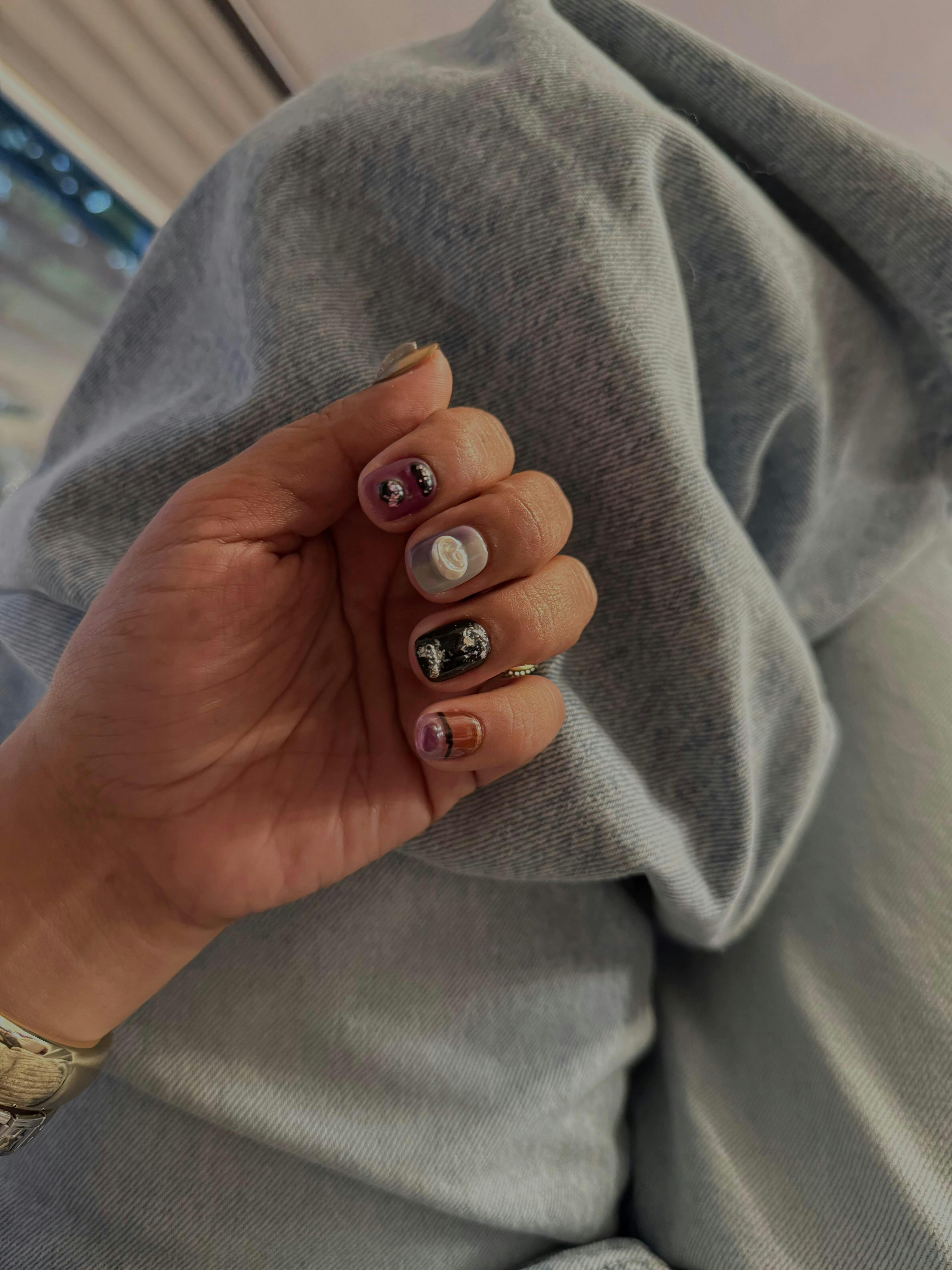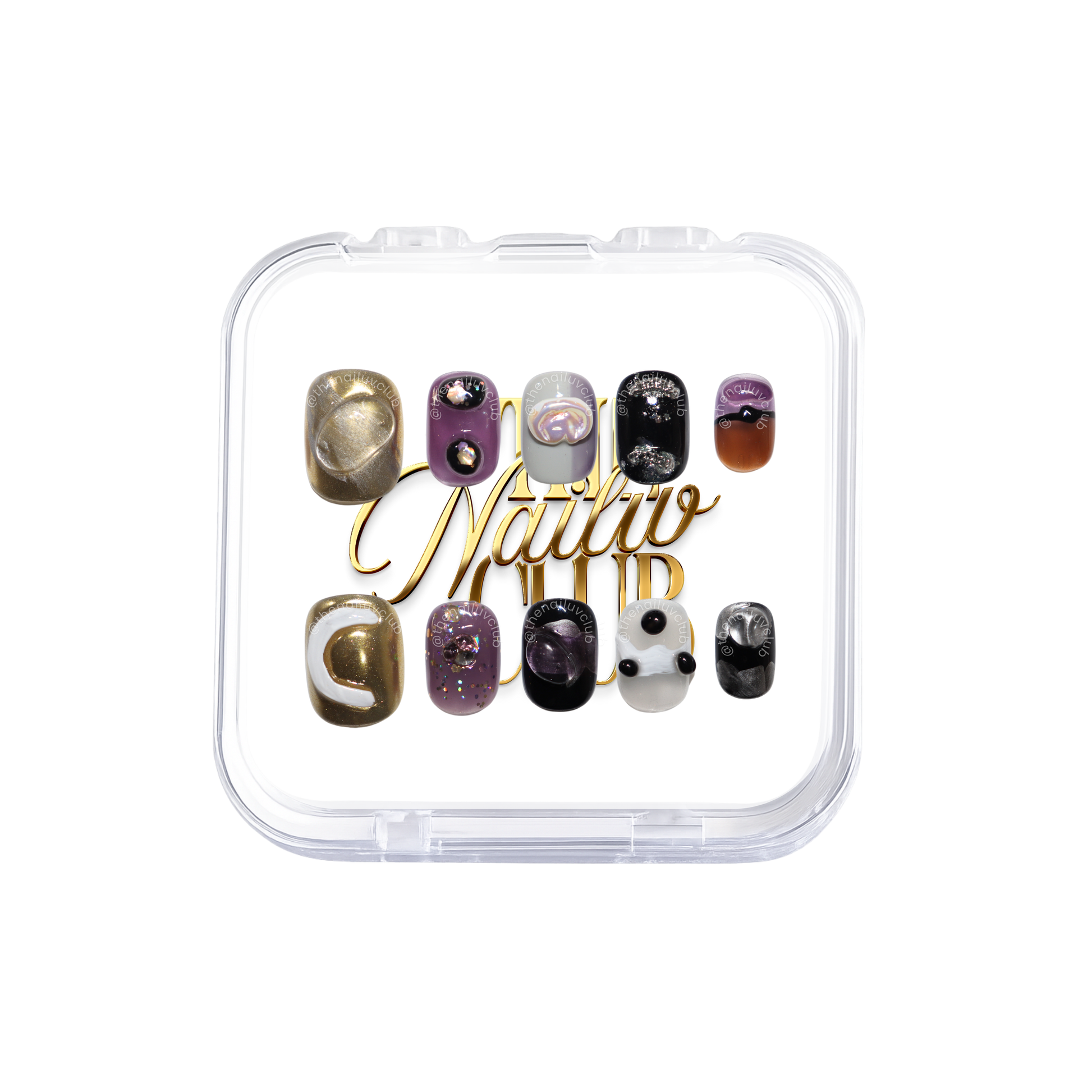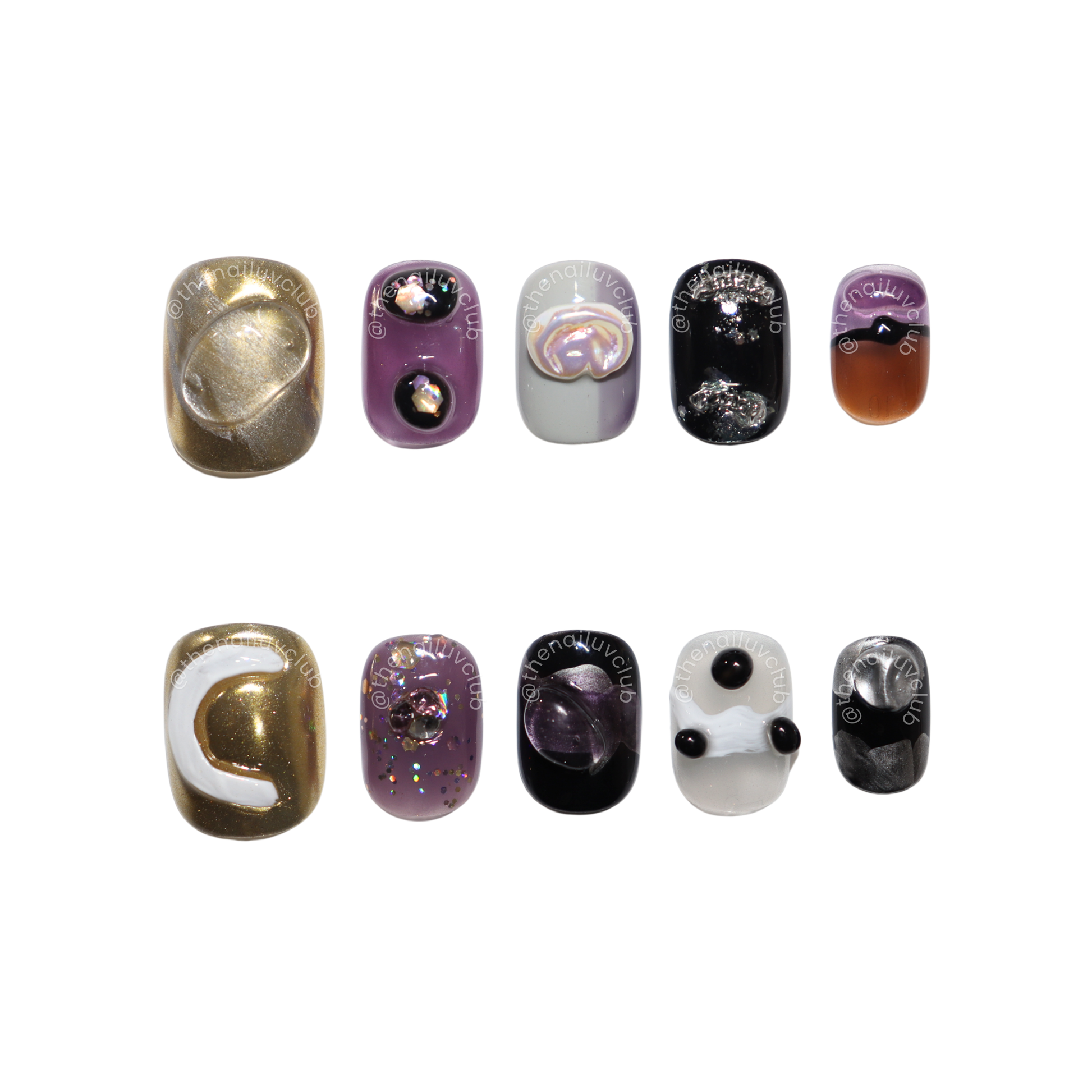 Combinación de tonos dorado, morado y negro con efectos metalizados y pequeños acentos de glitter. Un diseño poderoso, místico y lleno de energía.