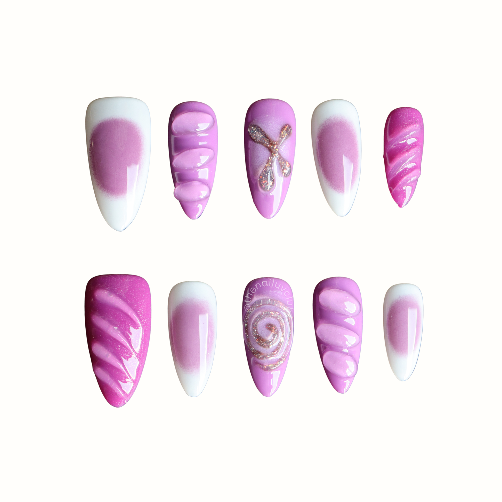 Un set vibrante y femenino en tonos morados con efecto degradado, relieves 3D y detalles brillantes en glitter. El contraste entre el rosa intenso y el blanco lo convierte en un diseño alegre, divertido y lleno de estilo.