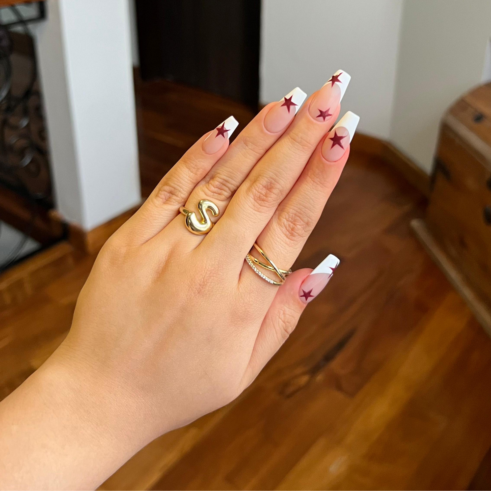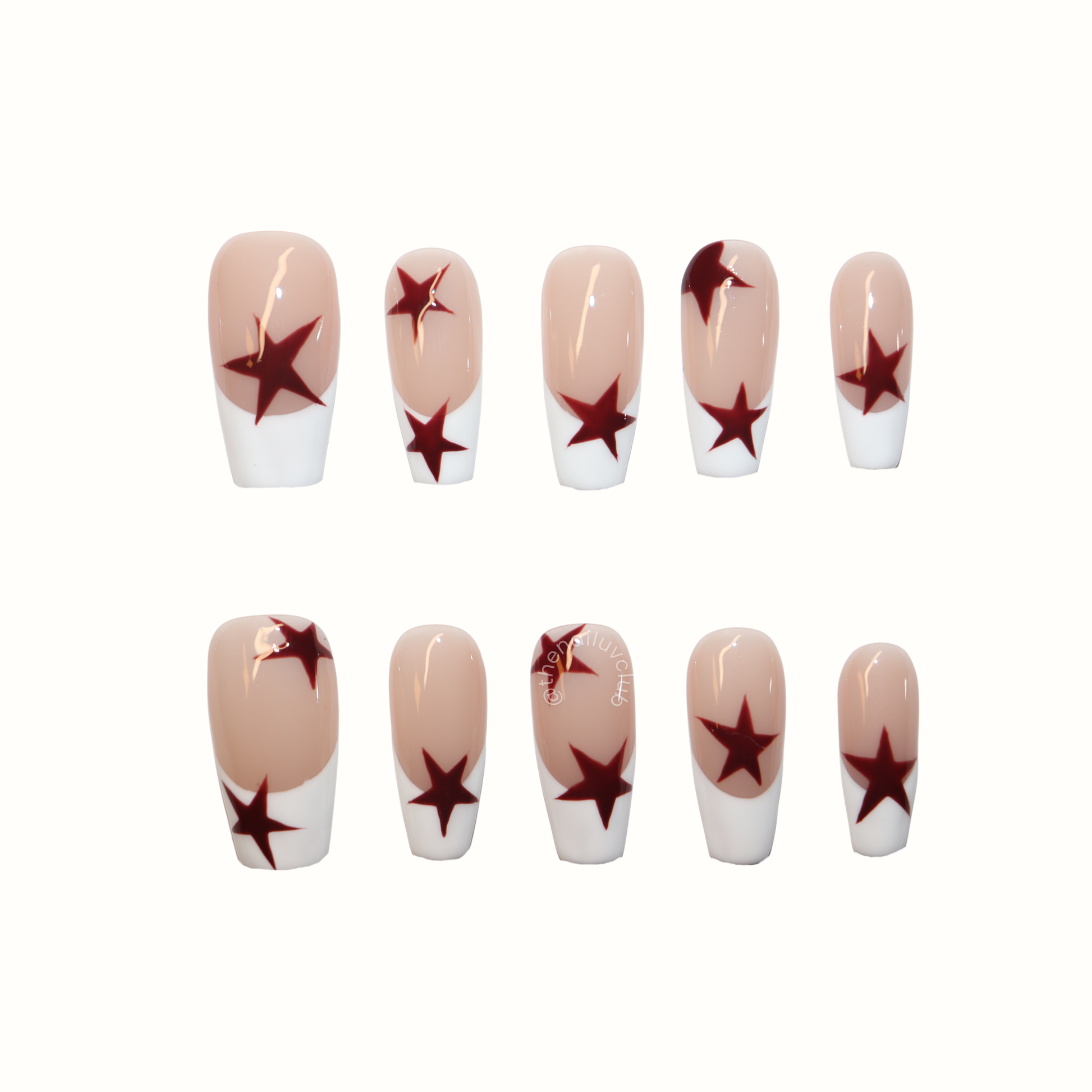 Un diseño moderno y llamativo que combina base nude con puntas blancas estilo francesa, decoradas con estrellas rojas intensas. Elegante pero divertido, ideal para darle un toque diferente a tu look clásico.