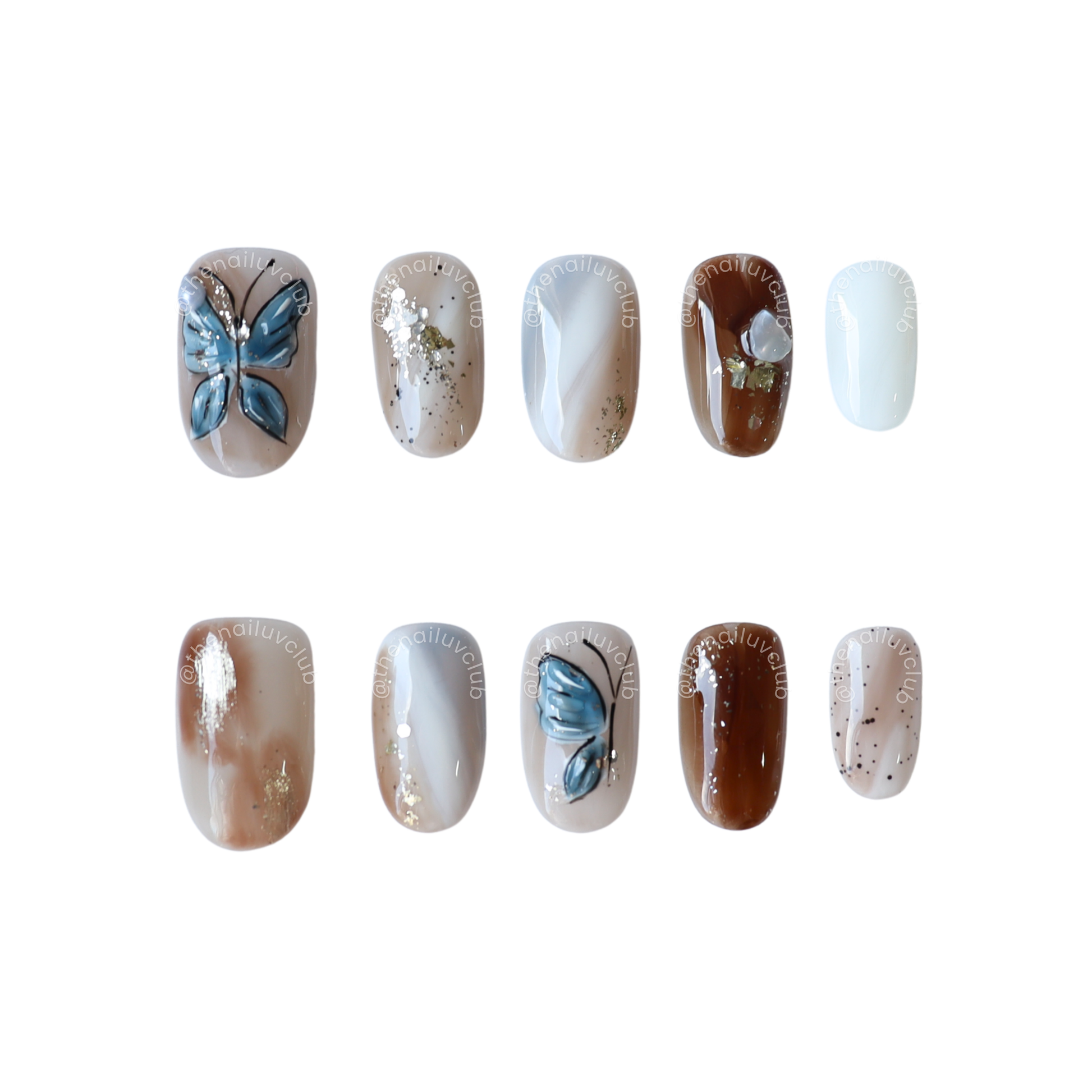 Un diseño delicado y artístico en tonos marrón, beige y azul con efecto marmoleado. La mariposa en azul es el centro de atención, transmitiendo elegancia y calma con un toque natural.