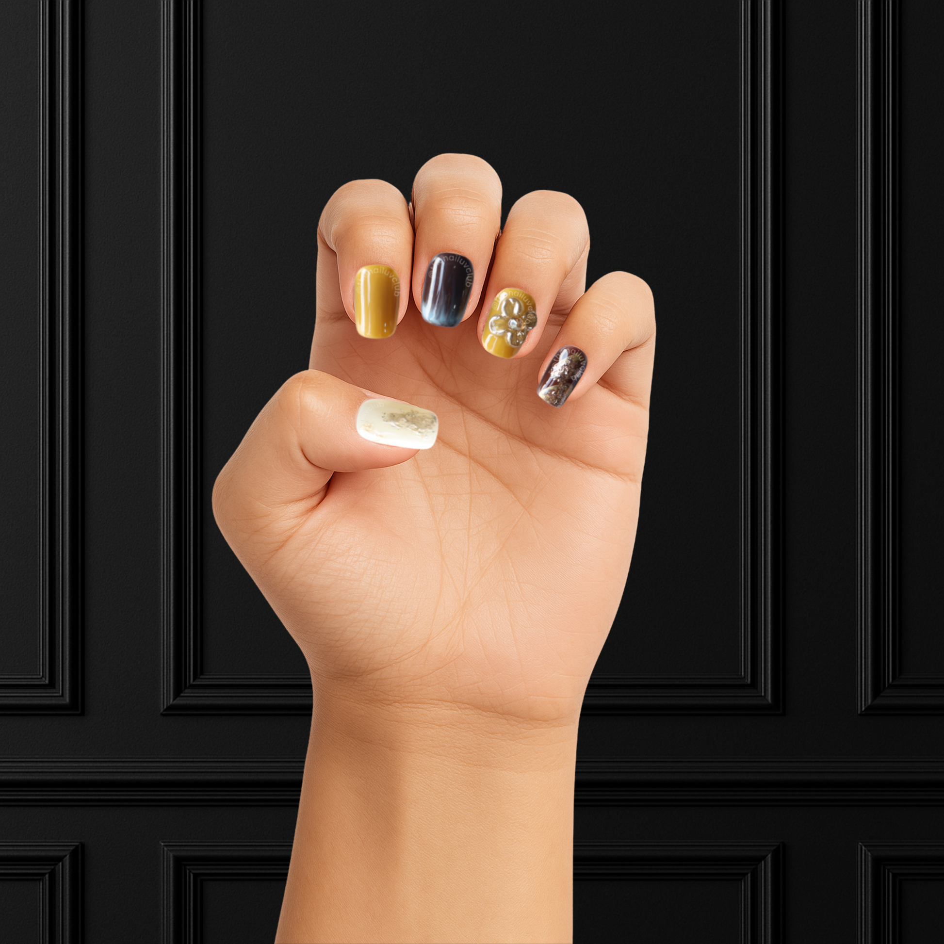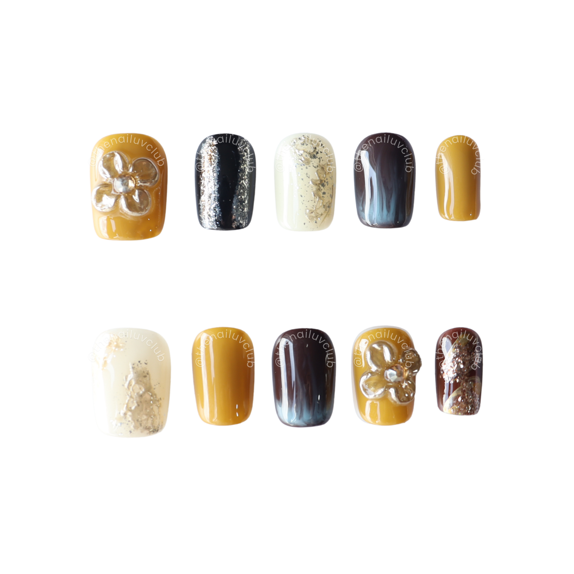 Un diseño cálido y elegante con tonos miel, dorado y café oscuro. Combina efectos metálicos, texturas brillantes y una flor 3D que resalta el look con un toque dulce y moderno. Perfecto para quienes aman los colores otoñales y sofisticados.