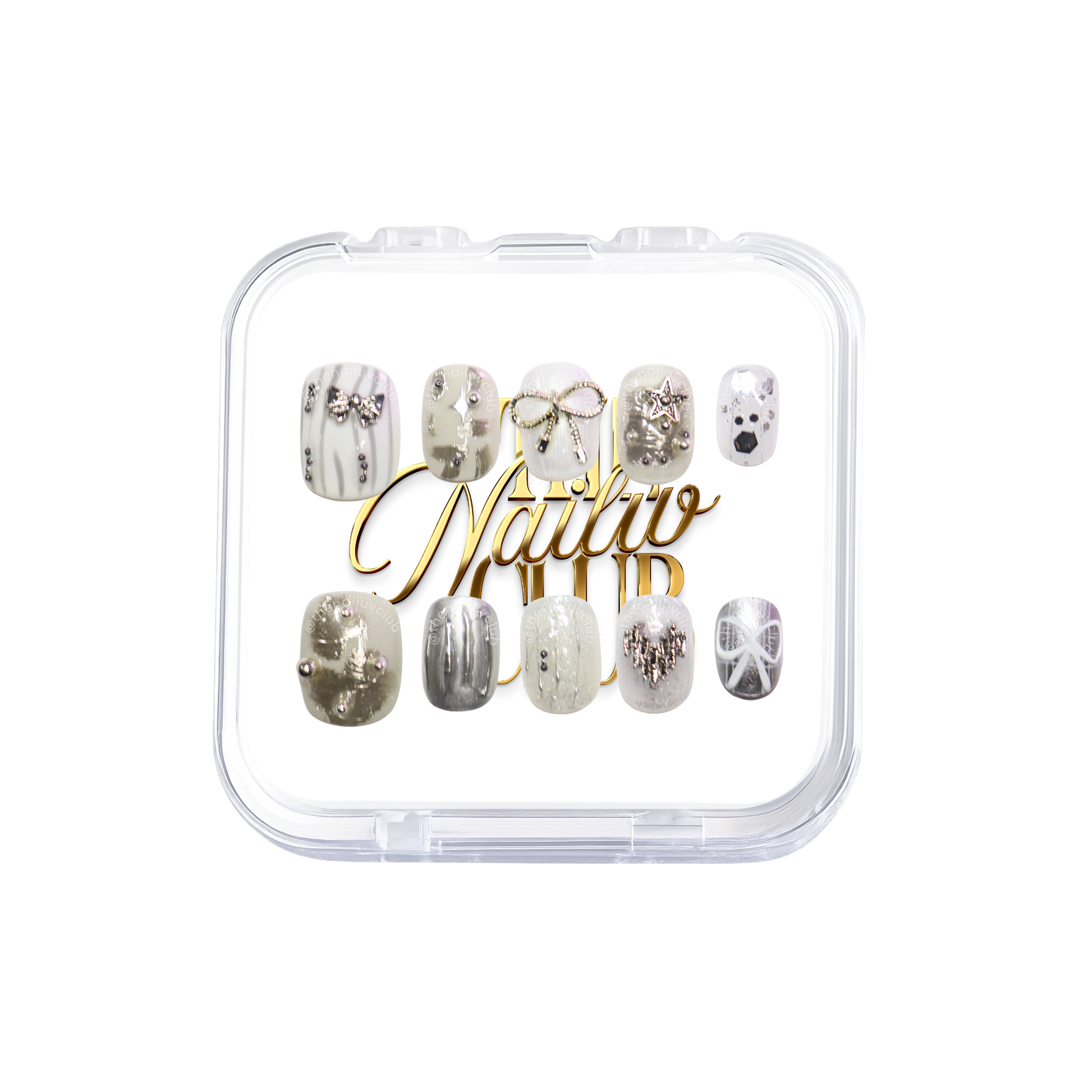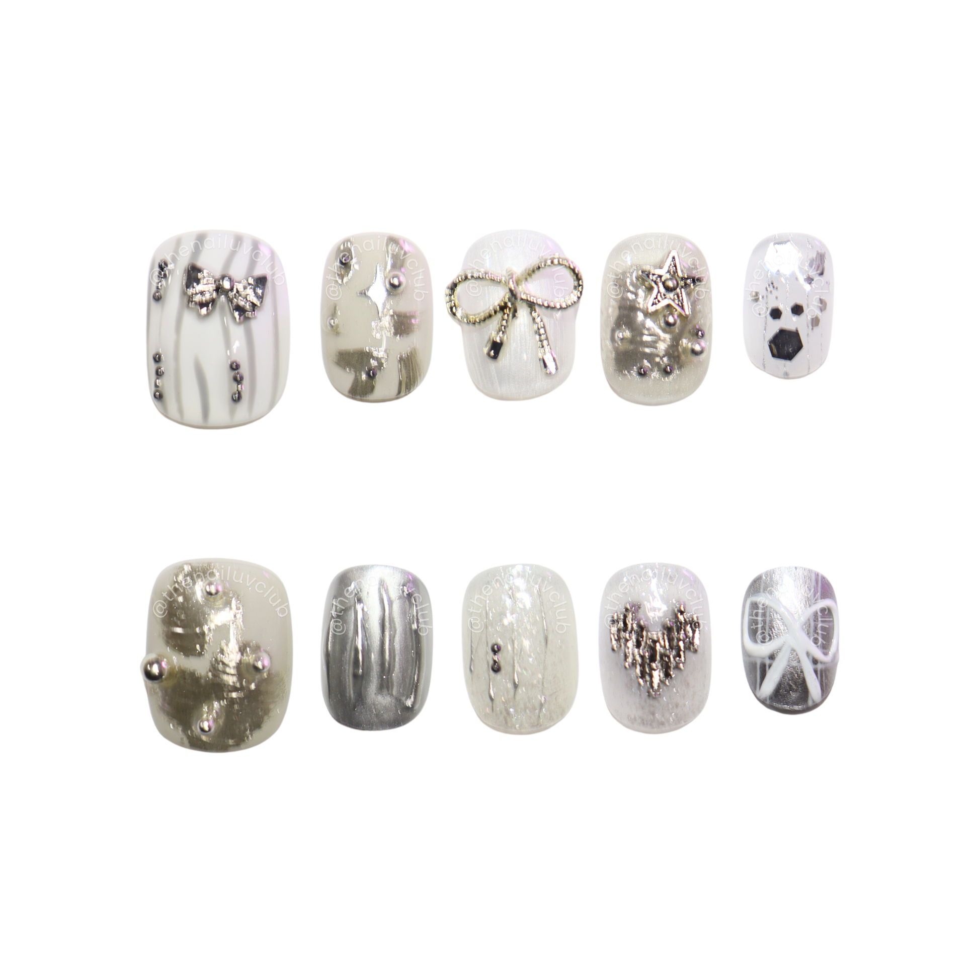 Un set elegante, metálico y súper chic. Silver Charm combina tonos blanco perla, gris suave y plateado con detalles 3D como moñitos, estrellitas, cristales y texturas metálicas que crean un look moderno, festivo y lleno de brillo. Perfecto para quienes aman los diseños minimalistas pero con ese toque glam que roba miradas.
