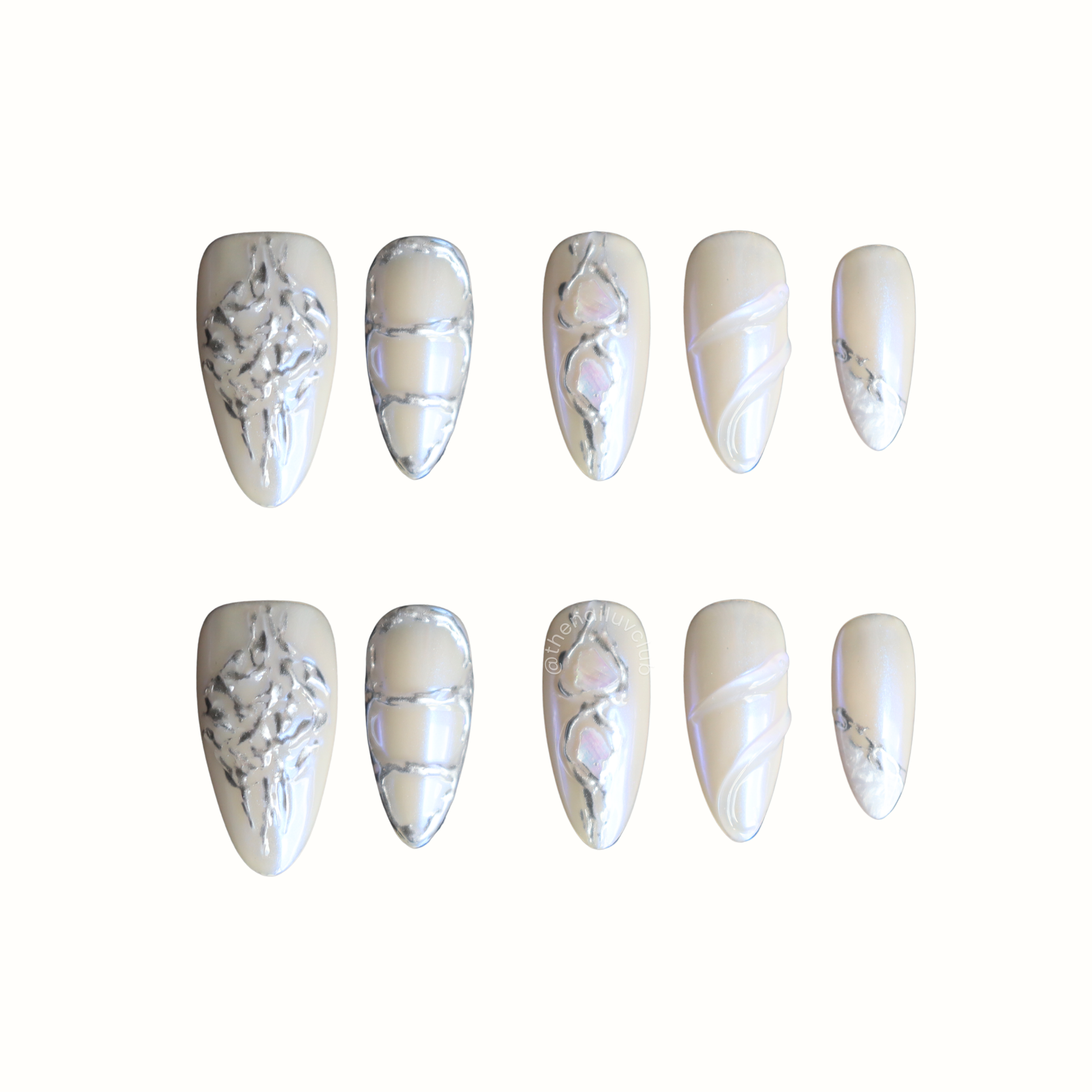 Un diseño futurista y elegante en tonos perla con relieves metálicos y efectos tipo cristal. Texturas plateadas, acabados nacarados y brillos tornasolados crean un look sofisticado y moderno.