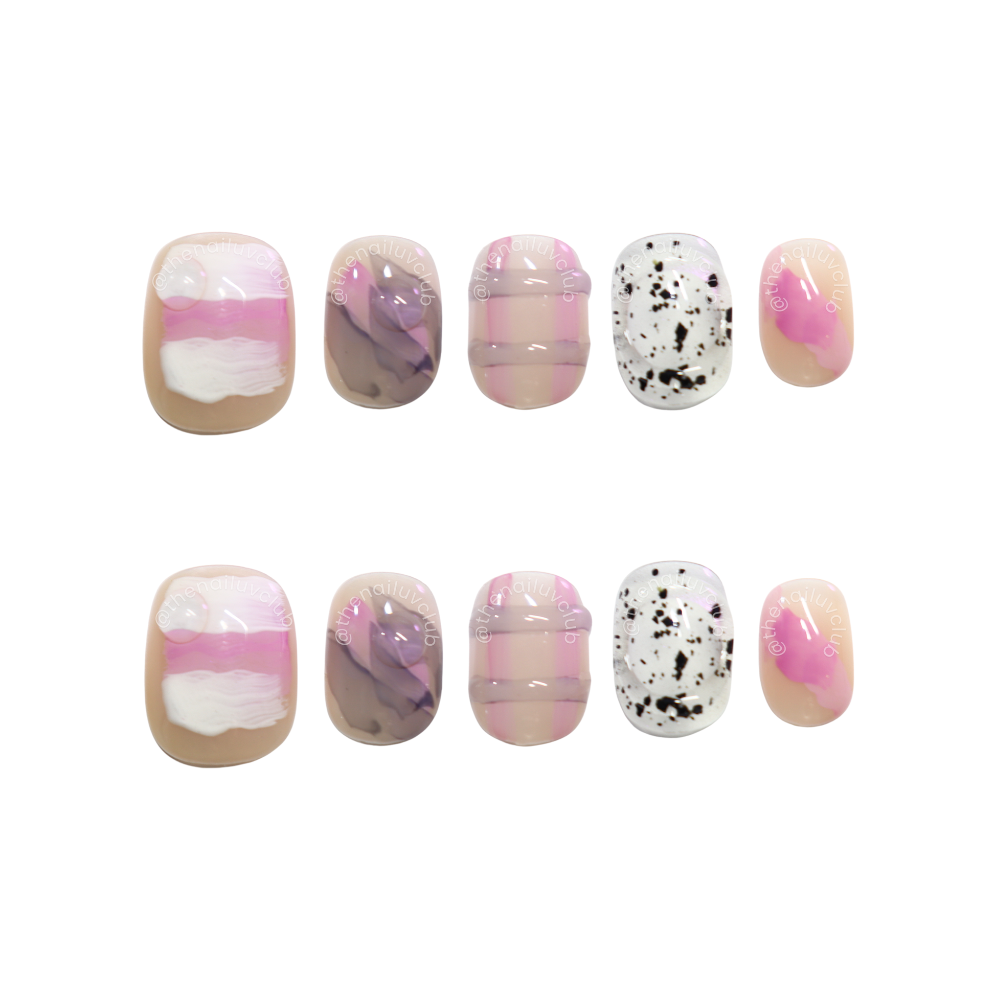 Un diseño dulce, suave y perfecto para todos los días. Con tonos nude, rosa, blanco y toques marmoleados en acabado glossy, además de acentos moteados tipo “speckled” que le dan un look moderno y artístico. Un set ideal para quienes aman lo cute, aesthetic y delicado.