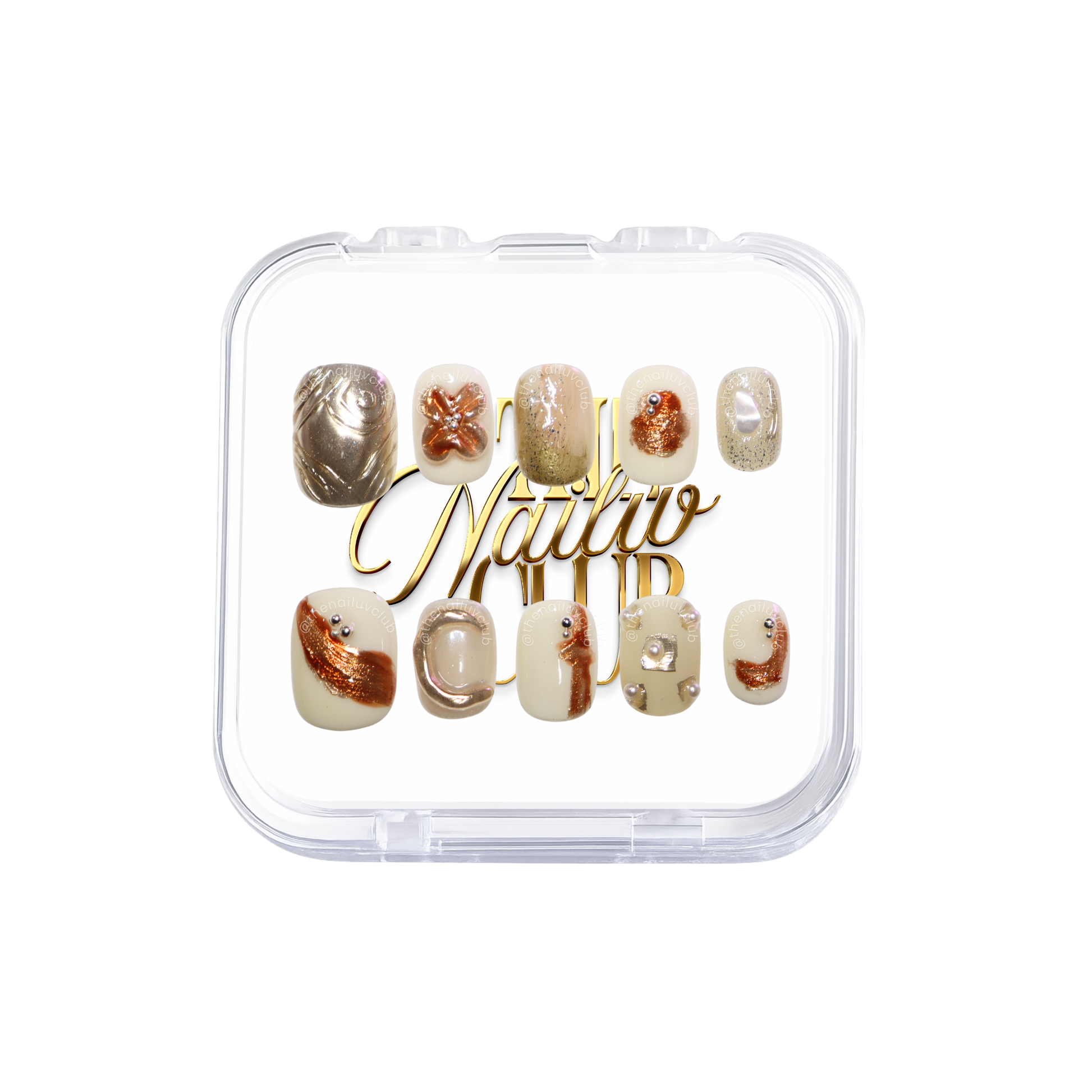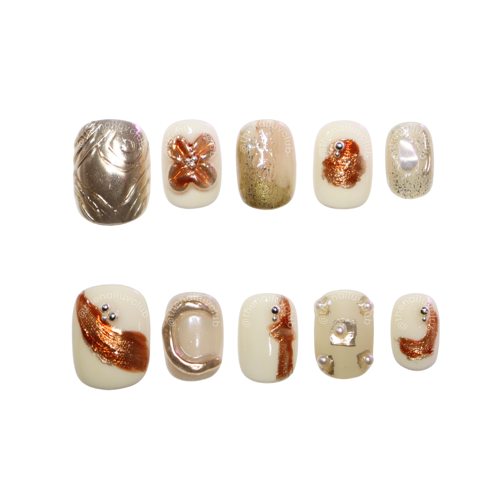 Tonos champaña, beige y bronce se unen con aplicaciones 3D metálicas y trazos de glitter cobrizo. Bronze Petal es elegante, cálido y perfecto para eventos, cenas o temporada festiva. Su combinación de texturas lo hace un diseño delicado pero glamuroso.