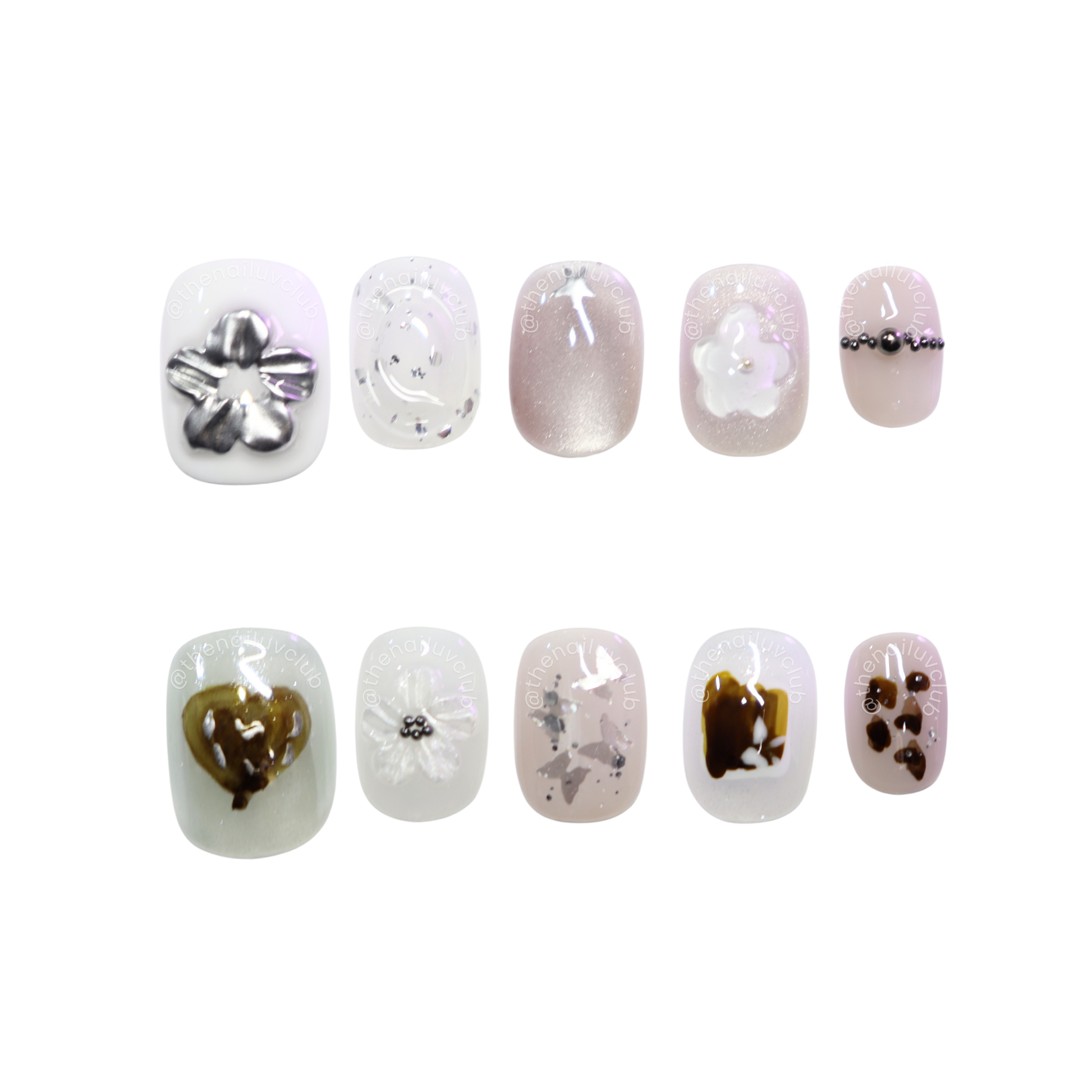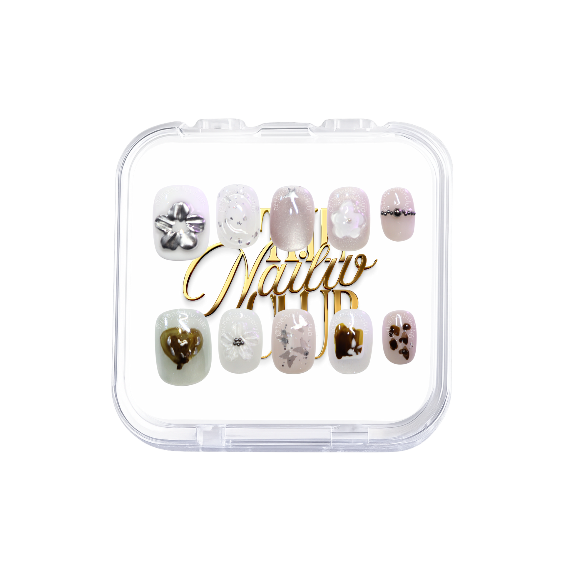 Un set suave y luminoso que combina nude, blanco perlado y dorado, decorado con moños, flores 3D y mini perlas metálicas. Soft Metallic Blossoms tiene un vibe romántico, angelical y elegante, perfecto para ocasiones especiales o looks delicados con brillo sutil.