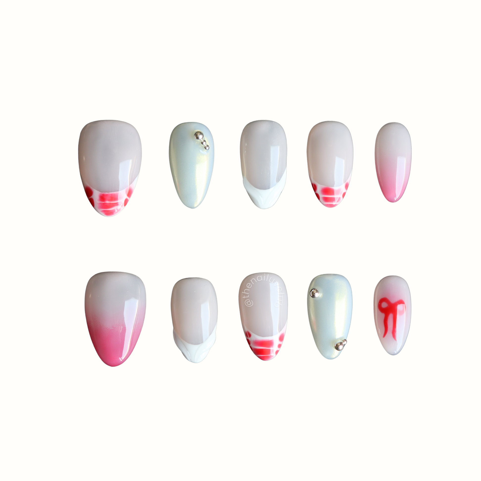 Un diseño minimalista y delicado con base nude y detalles sutiles en rosa, blanco perlado y toques en rojo. Incluye aplicaciones de mini perlas y acentos brillantes para un look discreto pero elegante.